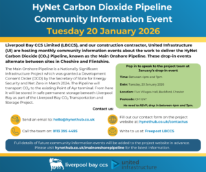 Liverpool Bay CCS Limited and United Infrastructure are hosting a community drop-in event to share information about the HyNet Carbon Dioxide (CO₂) Pipeline.